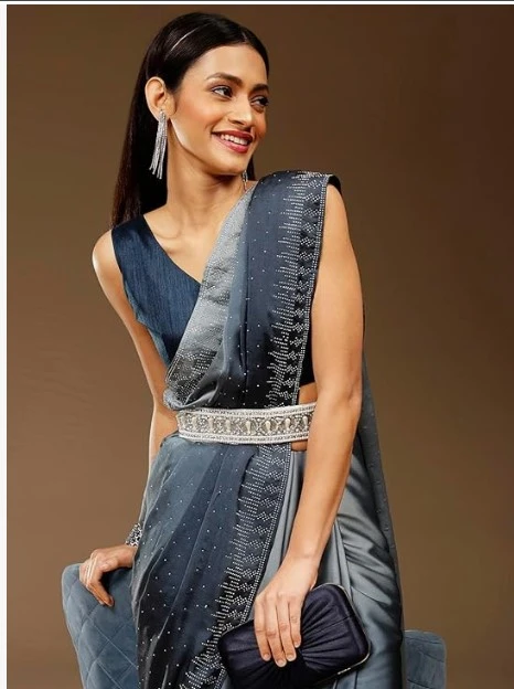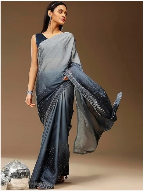 About this thing Variety: Fabric: Grey Saree and Grey Blouse Print or pattern: Georgette Saree | Banglori Silk Blouse Saree with Embroidery | Solid Blouse Work Details: Stone Work Saree Saree Length: 5.5 MTR || Pullover Length: 0.8 MTR, Free Size  |