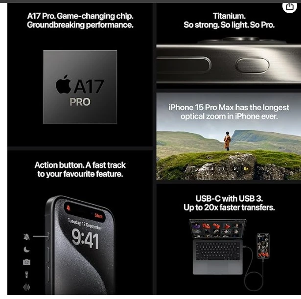 About this thing Manufactured IN TITANIUM — iPhone 15 Master has areas of strength for a light aviation grade titanium plan with a finished matte-glass back. It likewise includes a Clay Safeguard front that is harder than any cell phone glass. Also, it's sprinkle, water, and residue safe. High level Presentation — The 6.1" Super Retina XDR show with Advancement inclines up invigorate rates to 120Hz when you really want excellent illustrations execution. Dynamic Island rises alarms and Live Notices. Additionally, with Always-On display, your Lock Screen remains viewable, eliminating the need to tap it to remain informed. GAME-CHANGING A17 Expert CHIP — A Supportive of class GPU causes portable games to feel so vivid, with rich conditions and reasonable characters. The A17 Pro is also extremely efficient and contributes to an incredible all-day battery life. Strong Star CAMERA Framework — Get unbelievable outlining adaptability with 7 master focal points. Catch really high-goal photographs with more tone and detail utilizing the 48MP Principal camera. Additionally, take sharper closeups from a greater distance. Adaptable Activity BUTTON — Activity button is a most optimized plan of attack to your number one element. You only need to set the one you want, such as silent mode, camera, voice memo, shortcut, and other options. Then, at that point, press and hold to send off the activity.  |