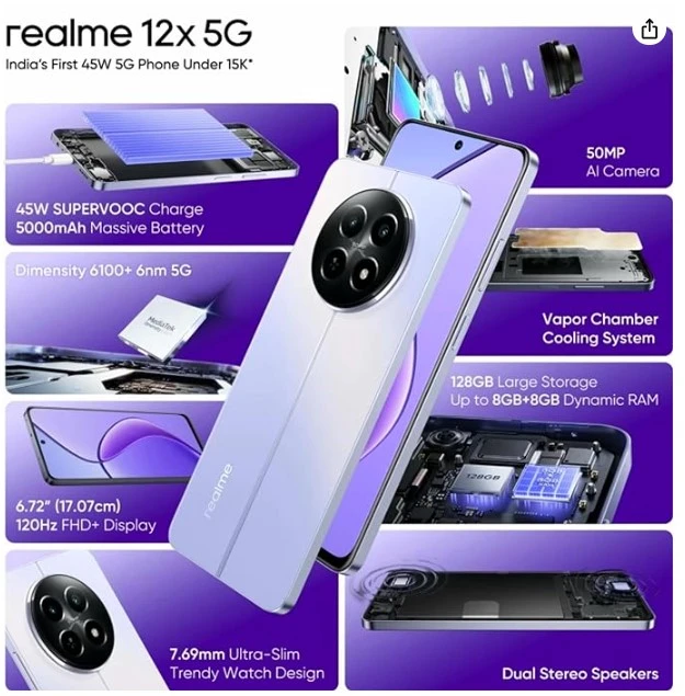 ☆【Slam, ROM And Expandable】:- 6 GB Smash | 128 GB ROM | Expandable Upto 2 TB || 128 GB Huge Capacity, With 128 GB of capacity, the Realme 12x 5G has all the space you really want for your photographs, recordings, applications, and that's just the beginning. Furthermore, with 6 GB of dynamic Slam, you can perform multiple tasks effortlessly, exchanging between applications without thinking twice. It resembles having an individual colleague in your pocket, prepared to assist you with handling anything the day tosses your direction. ☆【Display】:- 17.07 cm (6.72 inch) Full HD+ Show || 12.07 cm (6.72) 120 Hz FHD+ Show, Plan to be hypnotized by the Realme 12x 5G's shocking 120 Hz FHD+ show. Imagine being able to play your favorite mobile game or browse your social media feed with buttery smooth movement and crystal clear detail. It's like holding a doorway to a different world in your hand. Express farewell to movement obscure and hi to a genuinely vivid review insight. The Realme 12x 5G's 50 MP AI camera can capture life's moments in stunning detail. Camera: 50 MP + 2 MP | 8 MP Front Camera | 50 MP AI Camera Every shot is a work of art, from intimate portraits to breathtaking landscapes. Your photos will have the appearance of being taken by a professional photographer thanks to AI technology that improves color and sharpness. Say cheddar and let the Realme 12x 5G wrap up. ☆【Processor】:- Dimensity 6100+ Processor || Experience the up and coming age of availability with the Realme 12x 5G's Dimensity 6100+ 6nm chipset. Picture this: you're on an excursion, and you really want to explore a through new area. You can stream maps, make video calls, and keep in touch with loved ones at lightning-fast 5G speeds without missing a beat. Whether you're in the core of the city or outside of what might be expected, the Realme 12x 5G keeps you associated any place you go. ☆【Battery】:- 5000 mAh Battery || 45 W SUPERVOOC Accuse of 5000 mAh Monstrous Battery, Embrace the future of accusing innovation of the Realme 12x 5G's 45 W SUPERVOOC Charge. Envision this: Your phone's battery is running low as you rush out the door. With SUPERVOOC Charge, that is not an issue. In only a couple of moments, you'll have sufficient ability to last you as the day progressed. Say goodbye to the days when you were dreading the moment when your phone would charge. You can always go with the Realme 12x 5G. ☆【Show Other Features】:- 120Hz Revive Rate, Screen-to-Body Proportion: 91.40%, Variety Immersion: Aspect Ratio: 82% NTSC (typical), 78% NTSC (minimum). 20:9, Variety Range: 82% NTSC (Commonplace), 78% NTSC (Least), RGB Pixel Course of action, Difference Proportion: Sunshine Screen, Brightness: 1500:1, 240Hz touch sampling rate, 800 Nits (typical), 950 Nits (high brightness mode). ☆【Fume Chamber Cooling System】:- Don't allow overheating to dial you back. You won't have to worry about performance issues if you use the Realme 12x 5G's vapour chamber cooling system. Whether you're gaming for a really long time or performing various tasks like an ace, this cooling framework keeps your gadget moving along as planned, come what may.  |