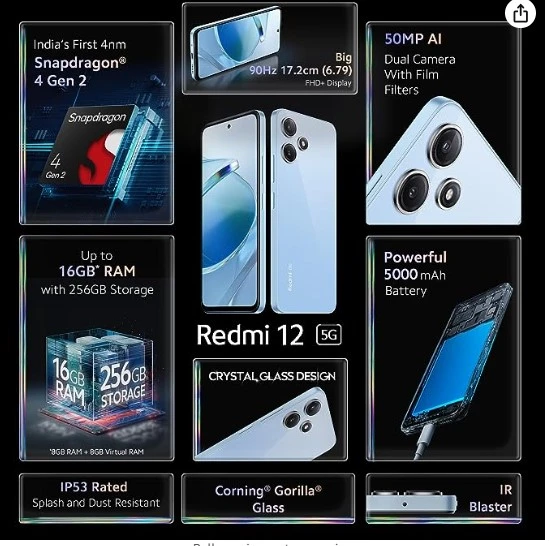About this thing Snapdragon 4 Gen 2 Portable Stage : Power proficient 4nm engineering | 8GB of Slam including 4GB Virtual Show: Corning Gorilla Glass 3 Protection Camera and a large 17.24-inch FHD+ 90Hz AdaptiveSync display: 50MP f/1.8 AI Dual Camera with Film Frame, Portrait, Night Mode, 50MP mode, Time-lapse, and Google Lens | 8MP Selfie Camera 5000mAh (type) Battery with 22.5W Charger in Box MIUI Dialer | MIUI 14 with Android 13 | Side fingerprint | IR blaster | 3.5mm Audio Jack | IP53 Rating  |
