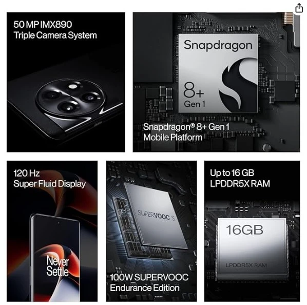 Camera: About this item: Sensor: The Sony IMX890 has a 50MP main camera with OIS support and an 8MP ultrawide camera (FOV: 120 degree) and Large scale Focal point; EIS-enabled 16MP front (selfie) camera. Camera Modes: Nightscape, Ultra HDR, Brilliant Scene Acknowledgment, Picture Mode, Genius Mode, Display, Slant Shift mode, Long Openness, Double View Video, Repair, Film Mode, Crude record, Channels, Very Steady, Video Nightscape, Video HDR, Video Representation, Center Following, Timelapse, Large scale mode Show: 6.7 Inch; Super Fluid AMOLED at 120 Hz; Resolution: 2772 X 1240 pixels ,450 ppi, 20.1:9, 10-cycle Variety Profundity, HDR10+ Working Framework: OxygenOS in light of Android 13 Processor: Mobile Platform with Snapdragon 8+ Generation 1 |
