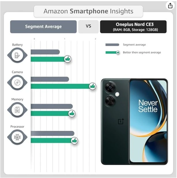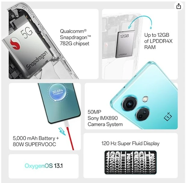 Camera: About this item: 50MP Principal Camera with Sony IMX890 (OIS upheld), 8MP Ultrawide Camera with Sony IMX355 (FOV: 112 degree) and 2MP Full scale focal point; 16MP Front (Selfie) Camera Camera Elements: Dual-view video, HDR, Nightscape, Portrait Mode, Video Portrait, Pano, Macro, Slo-mo, Time-lapse, Text-scanner, Retouching, Filters, Google Lens, Extra HD, Pro Mode Display: 6.7 Inch; 120 Hz AMOLED FHD+, Goal: 2412 x 1080 pixels; HDR 10+, sRGB, 10-bit color depth, and a 93.4 percent screen-to-body ratio OxygenOS 13 in view of Android 13.1 Processor: Qualcomm Snapdragon 782G Portable Stage Your fingers will shiver with each touch, tap, and swipe with Nord CE3's X-hub direct engine, highlighting upgraded touch reaction and 4D haptic vibration for super vivid gaming |