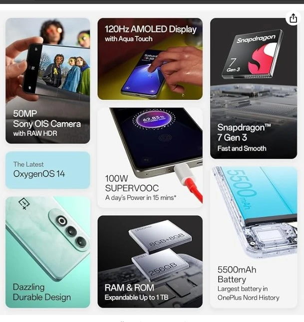 About this thing Processor: The Qualcomm Snapdragon 7 Gen 3 chipset not just gives your Nord CE4 senseless degrees of OnePlus Quick and Smooth execution, however it likewise watches your battery duration and augments power productivity. In addition, You get to encounter bursting download speeds up to 5Gbps convey endless portable gaming, work-from-anyplace efficiency, and that's just the beginning Plan: The OnePlus Nord CE4 is available in Dark Chrome, our signature color, and Celadon Marble, a first for Nord. Additionally, the bezel material of this phone is so tough that it is considering engaging in cage fighting. It is extremely durable. Truly, we dropped it 1.5 meters onto marble, and it made due. That is unbreakable! Battery and Charging: The most impressive quick charging in Nord history, with 100W SuperVOOC charging and 5500mAh Battery. Handle your low battery misfortunes like a supervisor with 100W SUPERVOOC quick charging that supports your telephone to 100 percent influence in a short time. Shrewd Charging 4.0 learns your use propensities to streamline charging and forestall overheating and battery maturing. After 10mins charging (from 1%), you get to appreciate · 7.3hrs of video watching (application: YouTube) · 19.7hrs of music tuning in (application: Spotify) voice calling for 10.9 hours (app: 6.7 hours of social media browsing (app: WhatsApp) Instagram) · 3.9hrs of gaming (application: Landmarks India) Slam and ROM: Nobody enjoys a sluggish telephone, so OnePlus Nord CE4 accompanies 8GB of Slam and up to 8GB of virtual Smash development to keep your application exchanging and stacking smooth and fast. Furthermore, you get heaps of room for saving proof of your undertakings, with up to 256GB of stockpiling (ROM) and a second SIM card space that upholds microSD cards for expandable capacity up to 1TB! Camera: SONY LYT-600 (IMX882) 50MP camera sensor with OIS guarantees that you get more steady and more clear pictures, regardless of rough terrain or lopsided landscapes, catch moving subjects and your unshakeable soul. Additionally, the OnePlus Nord CE4's flagship-level RAW HDR algorithm makes it easier to take portraits in bright sunlight. |