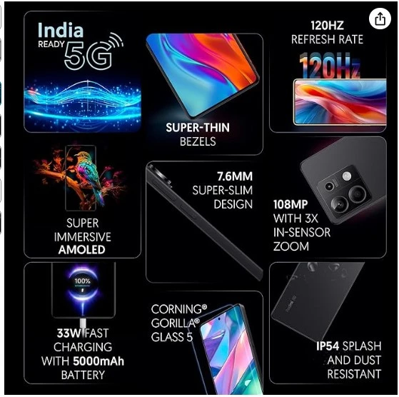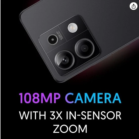 Display about this item: 6.67" FHD+ pOLED (1080x2400) Super limited bezels Show with 120Hz Invigorate rate; 1000nits top splendor; Corning Gorilla Glass 5 Showcase Security Processor: Mediatek Dimensity 6080 6nm Octa-center 5G processor for elite execution ; jusqu't 2.4 GHz; Upto 12GB Slam including 6GB Virtual Smash Camera: 108MP 3X in-sensor zoom computer based intelligence Triple Camera with 8MP Ultra Wide sensor and 2MP Full scale camera| 16MP Front camera Battery: Large battery of 5000 mAh with a built-in 33W fast charger and Type-C connectivity Memory, Storage, and SIM: 6GB RAM, 128GB UFS 2.2, and dual (nano and nano) 5G SIM cards |
