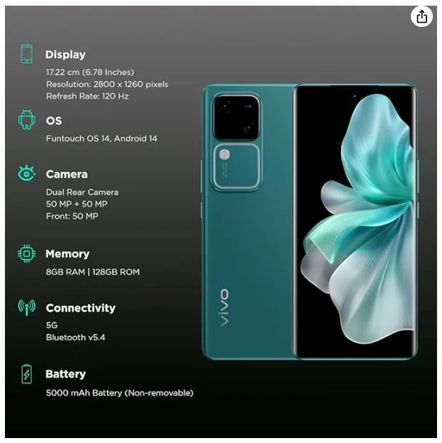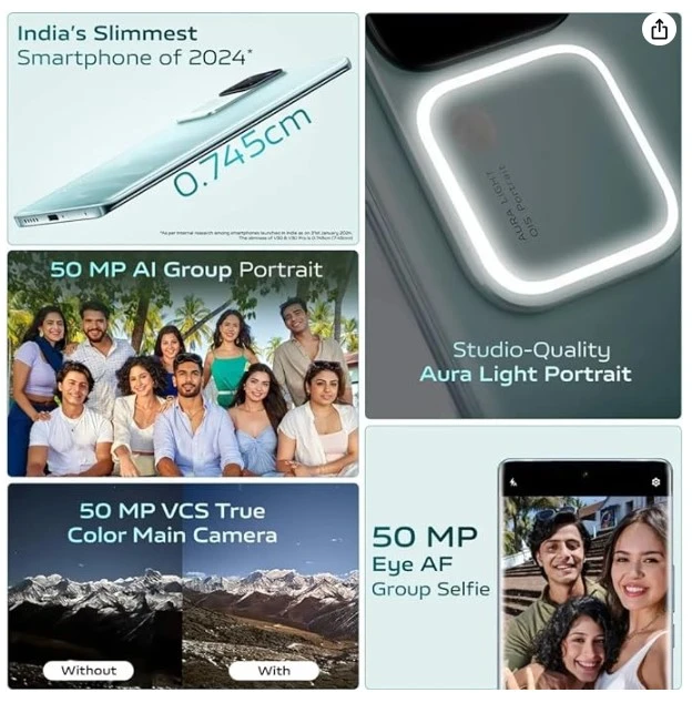About this thing Strong Execution: Outfitted with a Snapdragon7 Gen 3 processor and 8GB Slam, the Vivo V30 5G conveys smooth performing multiple tasks and slack free gaming. 17.22 cm (6.78 inch) Full HD+ Show gives lively tones and profound blacks for a vivid review insight. 50MP + 50MP | 50MP Front Camera Enduring Battery: A 5000mAh battery keeps the telephone controlled from sunrise till nightfall with moderate to weighty use over the course of the day. |