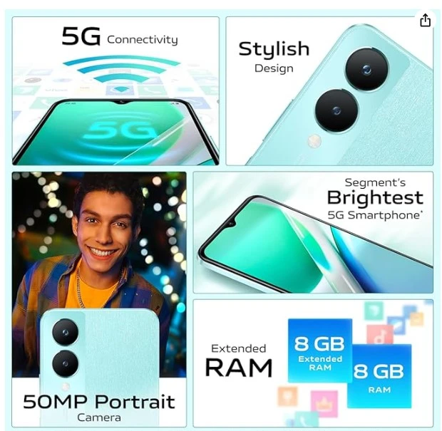 Camera: About this item: Dual 50MP+2MP Rear Camera, 8MP Selfie Camera, Slow-Mo Display, Rear Flash 6.56 inches (16.66cm) LCD Capacitive multi-contact show 90Hz invigorate rate, 269 ppi Memory and SIM: 8GB Slam | 128GB interior memory; UFS 2.2 | LPDDR4X Battery and charging: 5000 mAh Li-particle battery with 15W charging Side-mounted capacitive finger impression sensor Processor: Dimensity 6020 5G processor (in view of 7nm engineering) Camera highlights: Night, Portrait, Video, 50 MP, Pano, Live Photo, Slow Motion, Time Lapse, Professional, Documents |