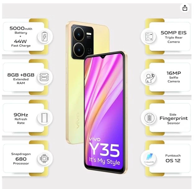 About this thing Camera Set-up: Electronic Image Stabilization (EIS) on the 50MP main camera, 2MP Bokeh Depth lens, and 2MP Macro lens. The front selfie camera: Features of the 16MP HD Selfie Camera include: Night (front and back), Picture, Photograph, Video, High Goal, Pano, Live Photograph, Slow-Mo, Time-Slip by, Master, Archives, Twofold Openness Show: 16.72 cm (6.58" inch) FHD+ LCD Show, 90Hz Invigorate Rate, 2408×1080 pixels, Water Drop Indent Plan, Memory and SIM: 8GB of RAM and 128GB of internal memory that can be expanded up to 1TB. Dual SIM and dual-standby. Speedy Charging: 44W quick accusing of 5000mAh battery Sensors: Accelerometer, Light Sensor, Closeness Sensor, Actual Spinner, E-compass, Side Finger impression Scanner Working Framework: Android 12 (Funtouch operating system 12) |